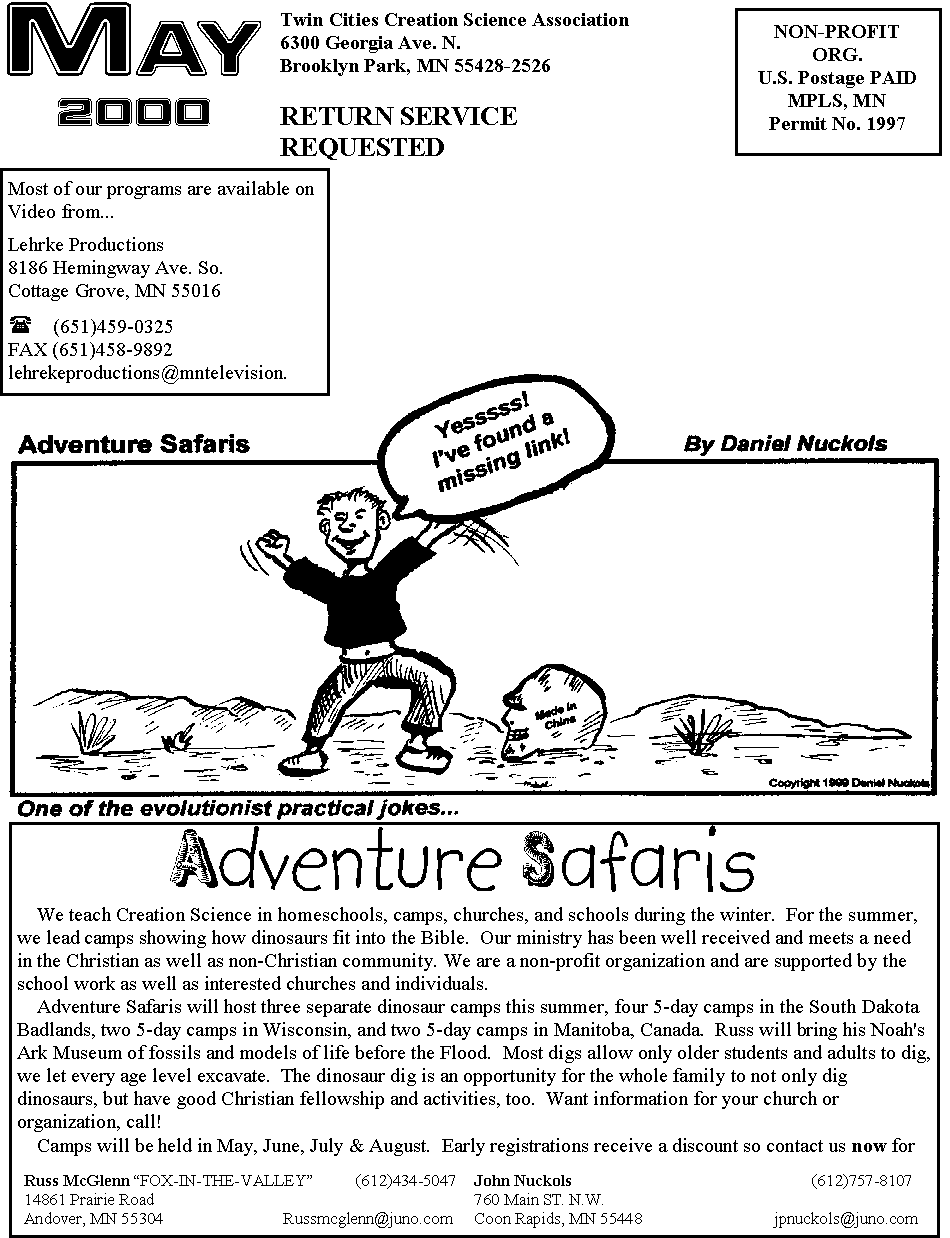June 13, 7 - 9 P.M. Spring Grove, MN High School William A. Hoesch, M.S., Geology, Institute for Creation Research, CA (507) 498-5386/5285 Feb 23-24, 2001 Ken Ham, Director of Answers in Genesis, will be speaking at the Sioux Falls, SD Convention Center. (605) 743-5972