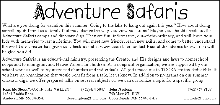 Lyndon Griffin, President lmgriffin{at}usfamily.net Dave Johnson, Editor david.johnson{at}netzero.net Russ McGlenn, Adventure Safaris russmcglenn{at}juno.com John Nuckols, Adventure Safaris jpnuckols{at}usfamily.net Ross Olson, Webmaster ross{at}rossolson.org Byron Twiss, Treasurer twissb{at}hotmail.com