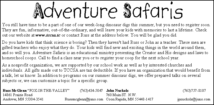 John Nuckols, Adventure Safaris          jpnuckols{at}usfamily.net