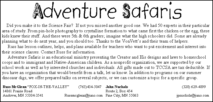 Lyndon Griffin, President lmgriffin{at}usfamily.net Dave Johnson, Editor david.johnson{at}netzero.net Russ McGlenn, Adventure Safaris russmcglenn{at}juno.com John Nuckols, Adventure Safaris jpnuckols{at}usfamily.net Ross Olson, Webmaster ross{at}rossolson.org Byron Twiss, Treasurer byrontwiss{at}msn.com