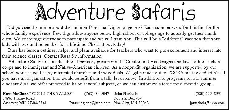 Lyndon Griffin, President lmgriffin{at}usfamily.net Dave Johnson, Editor david.johnson{at}netzero.net Russ McGlenn, Adventure Safaris russmcglenn{at}juno.com John Nuckols, Adventure Safaris jpnuckols{at}usfamily.net Ross Olson, Webmaster ross{at}rossolson.org Byron Twiss, Treasurer byrontwiss{at}msn.com