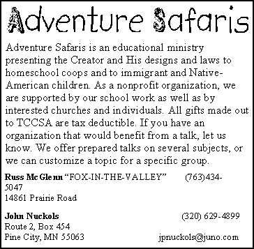 Al Heitkamp, Interim President alrolene{at}aol.com Dave Johnson, Editor david.johnson{at}netzero.net Russ McGlenn, Adventure Safaris russmcglenn{at}juno.com John Nuckols, Adventure Safaris jpnuckols{at}usfamily.net Ross Olson, Webmaster ross{at}rossolson.org Byron Twiss, Treasurer byrontwiss{at}msn.com